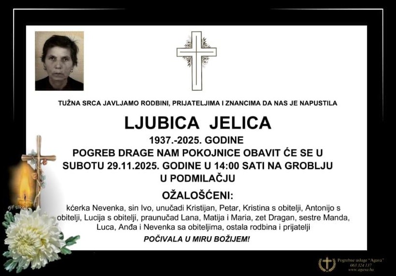 U petak, 28. studenoga 2025., u 89. godini života blago u Gospodinu preminula je Ljubica Jelica, majka naše s. Nevenke Jelica. Posljednji ispraćaj pokojne Ljubice biti će u subotu 29. studenoga 2025. u 14 sati na groblju u Podmilačju.