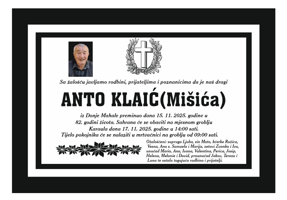 U subotu 15. studenoga 2025.  u 82. godini života blago u Gospodinu preminuo je Anto Klaić, otac naše s. Samuele Klaić. Posljednji ispraćaj pokojnog Ante biti će u ponedjeljak 17. studenoga 2025. u 14 sati na groblju Karaula u Donjoj Mahali.